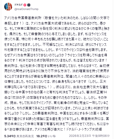 外界は、関税に関する最高裁の判決が北京に有利だと考えているが、北京は、最高裁はトランプがいつでも行使できる関税兵器の一部を削除しただけで、すべての兵器を削除したわけではないと考えている。301条は中国にいつでも適用可能であり、中国はレアアースを除いて、今年の大豆購入の大部分をすでに完了している。