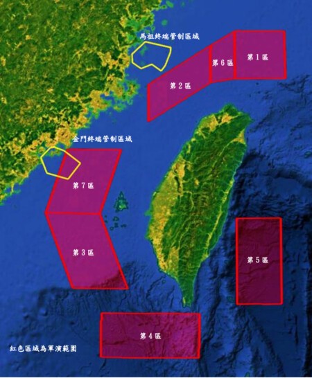 台湾国防部は同日午後の記者会見で、中共が設定した5つの軍事演習区域の中には、台湾の領海(12海里)にまで及ぶものがあることを確認した。