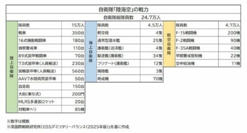 そうした事態になった時、果たして自衛隊は中国軍と対峙できるのか──。英シンクタンク・国際戦略研究所(IISS)の『ミリタリー・バランス(2025年版)』のデータなどを中心に、その実力に迫る(別掲表参照)。