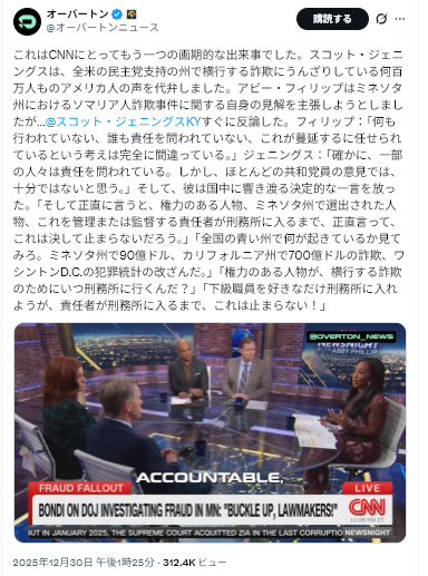 「そして正直に言うと、権力のある人物、ミネソタ州で選挙で選ばれた人物、この制度の管理や監督の責任者が刑務所に入るまでは、正直言って、この制度は決して止まらないだろう」