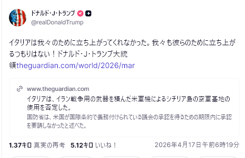 戦後にホルムズ海峡に掃海艇を派遣できるように法律改正するか解釈変更する動きを高市内閣は見せても良かった。戦後であればイランも悪く思わないし、メローニから非難され、孤立無援のトランプに助け船を出すこともできたのではないか。外交は友好が総てではない。国益を比較衡量して決するもの。