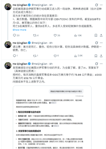 米国メディアがイランに対する米軍作戦のコストについて議論しているのに気づいた。全面的に理解するためにAIで調べたところ、結果は以下のとおり(具体的にはリンクのグラフをご覧ください)。現在の価格で計算すると、1日あたりの直接軍事コスト1,300万ドルは約75.66kgの金に相当し、4,000万ドルは約232.79kgの金に相当する。