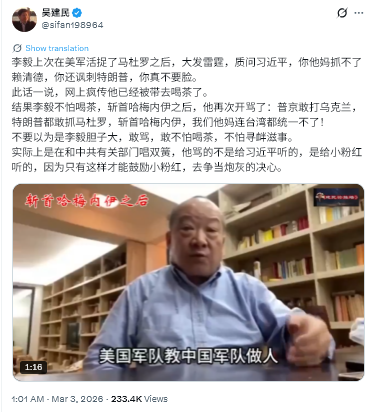 李毅は前回、米軍がマドゥロ大統領を生け捕りにした際、激怒し、習近平に「頼清徳を逮捕もできないくせに、いまだにトランプを皮肉るなんて、恥知らずだ」と問い詰めた。その後、李毅が尋問のために連行されたという噂がネット上で広まった。しかし、李毅は尋問を恐れていなかった。ハメネイ師を斬首した後、彼は再び激しい非難を浴びせた。「プーチンはウクライナを攻撃し、トランプはマドゥロを逮捕し、ハメネイを斬首した。我々はクソ、台湾統一すらできない!」。李毅はただ大胆で、罵詈雑言を吐き、尋問を恐れず、問題を起こすことを恐れないだけだと考えてはいけない。実際、彼は中共の関連部門と二人羽織しているのだ。彼の侮辱は習近平に向けられたものではなく、「小ピンク」(若い愛国主義的な中国ネットユーザー)に向けたものだ。なぜなら、そうすることでのみ、「小ピンク」たちが砲弾の餌食になる決意を鼓舞できるからだ。
