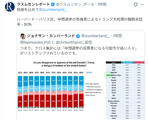 3/2Rasmussen Reports<Trump Approval Down One Point in February=トランプ大統領の支持率は2月に1ポイント低下>