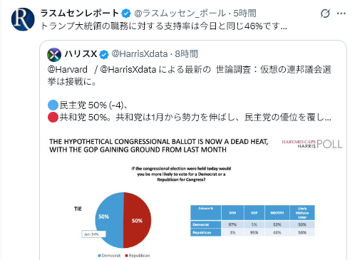 トランプ支持率は46%。共和党が50%。