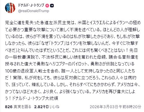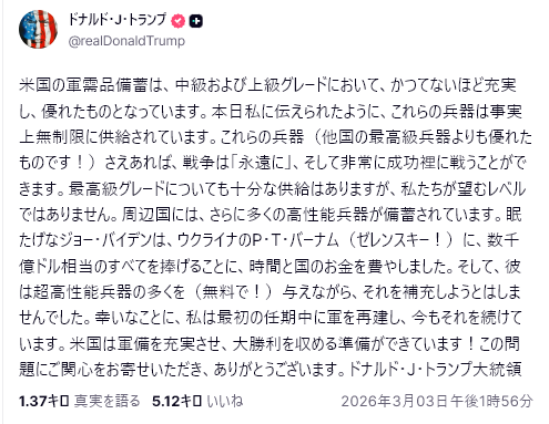 3/2、ピート・ヘグゼス戦争長官はイラン問題に関する立場を表明し、攻撃と撤退という新たな戦争原則を明確に示した。「愚かな交戦規則はなし(これは国連や英国などの同盟国が協議した法的手続きを直接否定するものだ)、国家再建もしない、民主主義の輸出もしない…我々は勝利のために戦う。時間を無駄にするためでも、命を無駄にするためでもない。」— トランプは、イランの現政権を破壊し、イラン国民に引き渡すと述べたが、多くの人々は未だに彼の意図を理解していない。