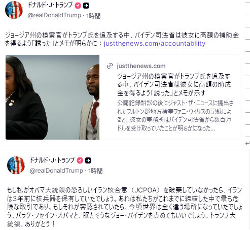 朝香氏の記事では、「日本の立場からすれば、今回の軍事作戦の成功は歓迎できるものだと私は思う。」とありますが、正にその通り。米国のベネズエラとイラン攻撃は中共の手足をもぎ取るための行動で、原油輸入のことを考えれば、中共の台湾侵攻に歯止めがかかる。台湾有事の高市発言にあったように、米軍が中共軍と対峙したなら、日本は必ず戦場になる。その危機の確率をトランプが下げてくれたのだから、日本は感謝すべき。高市首相は世界の様子を見るのでなく、米国支持を打ち出すべき。