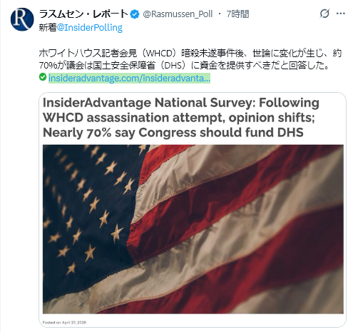 4/27Rasmussen Reports<Democrats’ Advantage Wider on Social Security=社会保障問題で民主党の優位性がさらに拡大>