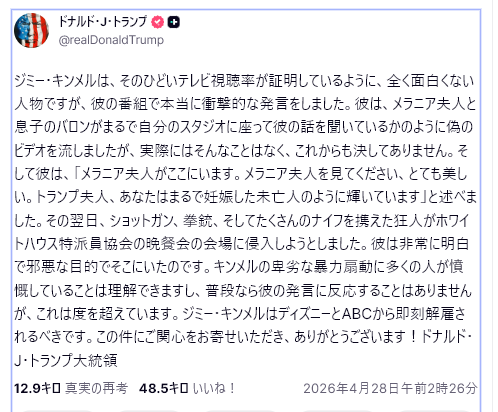 カリフォルニア州トーランス在住のコール・トーマス・アレン容疑者(31歳)は、WH特派員協会の夕食会が開かれていたワシントン・ヒルトンホテルで発砲し、警備を突破しようとした。トランプ大統領、メラニア夫人、バンス副大統領、閣僚らは無事避難した。