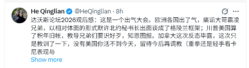 ダボス会議2026の感想:これは怒りをぶちまける場だった。欧州諸国は怒りをぶちまけ、長兄が弟を虐めていると非難し、NATO事務総長がグリーンランドの枠組み交渉を比較的体面を保った形で行うことを黙認した。トランプの米国は過去の旧弊を清算し、弟たちに悪い事を知り、恩に報いることを教えた。今回はカナダが反対の態度を取ったが、今回は単なる教訓で、米国なしではあなた方は今日生きられなかった。今後の再教育を待ちなさい(それが大きな打撃になるか軽い打撃になるかはカーニーのパフォーマンス次第である)。
