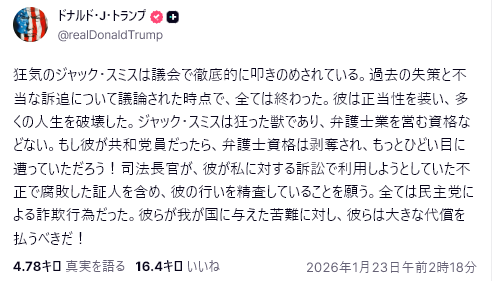 しかし翌17日、イランの最高指導者ハメネイ師は演説で「数千人が死亡した」と認めつつ、米国とイスラエルが扇動したと非難し、「トランプはイラン国民に対する犯罪者だ」と強烈に反撃した。