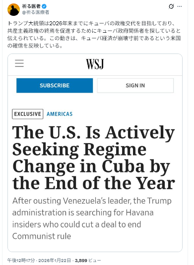 「米軍によるマドゥロ氏の拘束と、それに続くトランプ政権によるベネズエラ政府からの譲歩の獲得の成功は、キューバにとっての青写真とみなされている」と米当局者は述べた。