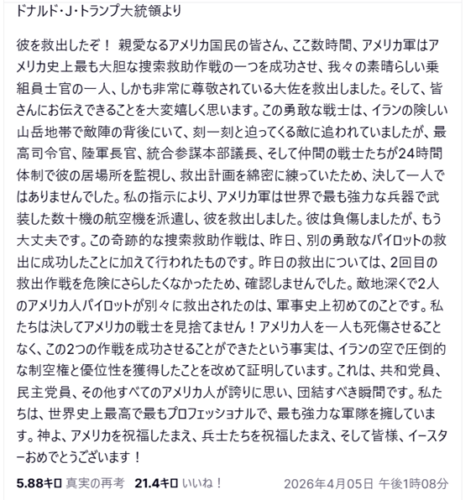イランは米F-15戦闘機、A-10攻撃機を撃墜したというのであれば、イランにはまだミサイルが残っており、米・イスラエルは完全には制空権を取れていない。簡単に屈服はしないと言うこと。ホルムズ海峡封鎖は一部船舶通航の話もあるが、まだ数は少ない。4/4現在、日本のタンカーは戦争開始後2隻(商船三井)だけ。米国は止めても、イスラエルとイランは長期戦になりそう。