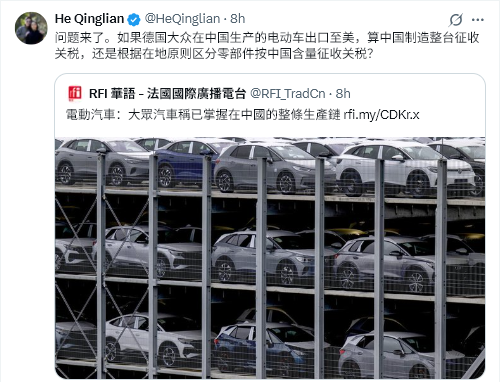 問題は、フォルクスワーゲンが中国で製造した電気自動車を米国に輸出した場合、「Made in China」とみなされて関税が課されるのか、それとも現地生産原則に基づき、中国製部品の比率に基づいて関税が課されるのか、どちらなのか。