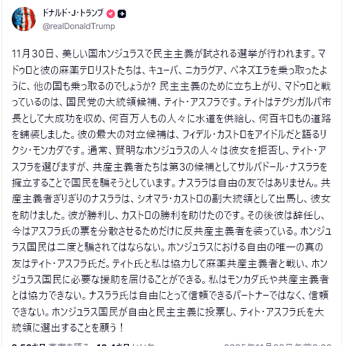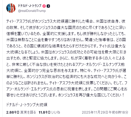 その後、トランプ側がSNS「トゥルース・ソーシャル」上でこの会談について述べた部分には台湾や日中外交の衝突問題ついては触れられておらず、ウクライナやフェンタニル、中国が購入する米国産大豆について討議し、「我々と中国の関係は極めて強固である」とし、来年4月に習近平から訪中の招待を受け、また習近平を米国に招待した、としている。