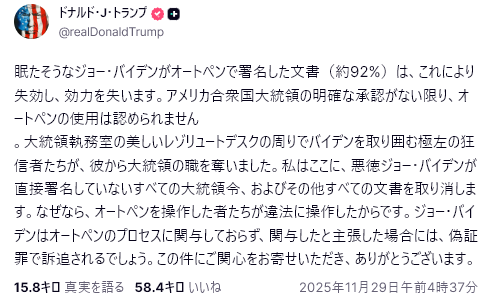 だがWSJの記事にもあるように、高市に発言撤回の圧力をかけた形跡はない。つまりトランプの発言は習近平からの泣き言を受けて、一応形だけは対応した、という程度のものだ、と私は見ている