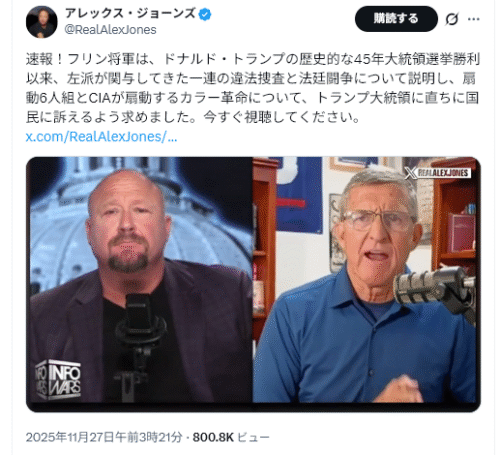 11/28The Gateway Pundit<General Flynn Calls for President Trump to Warn the Nation of Another Deep State Color Revolution=フリン将軍はトランプ大統領に対し、ディープステートによる新たなカラー革命について国民に警告するよう呼びかけた。>