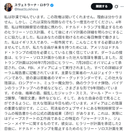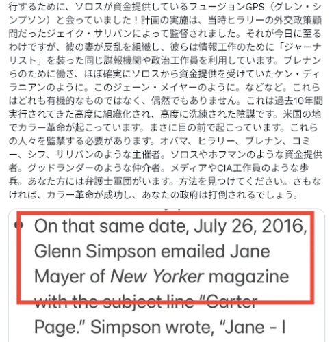 ダーラム調査は、ヒラリー・ソロス計画に端を発する壮大な陰謀を暴きました。この反トランプ計画は、2016年7月26日にヒラリー・オバマ、7月28日にオバマによって承認され、CIA、FBI、そしてメディアによって実行されました。詳細はダーラム報告書に記載されています。主要な立案者の一人はジェイク・サリバンであり、彼の妻は扇動家マギー・グッドランダーです。