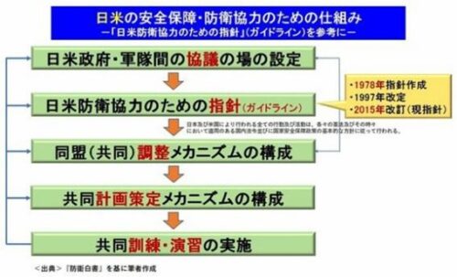 日米の安全保障・防衛協力のための仕組みは、下記の図の通り、日米政府・軍隊間で協議の場が設けられ、そこで「日米防衛協力のための指針」、いわゆる「ガイドライン」が作成される。