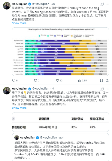 世論調査によると、エピック・フューリー軍事作戦は「旗の下に結集する効果」を引き起こさなかったことが示されている。以下は、2026年2月28日の軍事行動後に1,618人の米国登録有権者を対象に実施されたMorning Consultの分析データである。誤差はプラスマイナス2%。主な調査結果は以下の通り。