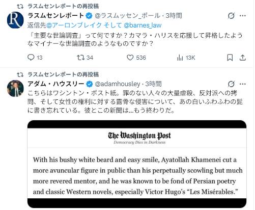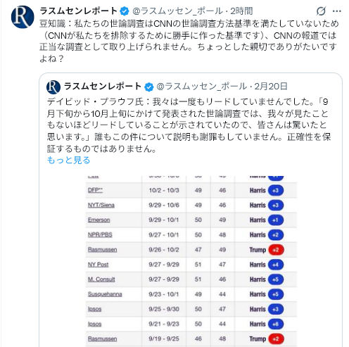 Twitter👇の2つのメッセージで、これは時代遅れの世論調査で、戦況に応じて支持に変わるというコメントが1件、簡単な告知である。2つ目のメッセージのリンクは攻撃後の分析である。支持者はわずかに増加したが、各戦争開始後に見られる支持率の大幅な上昇(米国の政治アナリストが(「旗の下に結集する効果」と呼ぶもの)とは異なり、そのレベルには程遠い状況である。現在、様々な分析を精査している。