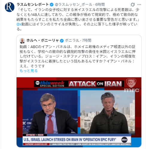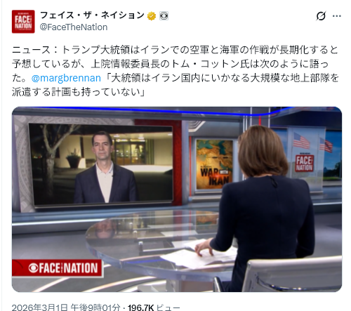 3/1The Gateway Pundit<Senator Tom Cotton Spars with CBS’s Margaret Brennan, Defends President Trump’s Military Action in Iran (VIDEO)=トム・コットン上院議員がCBSのマーガレット・ブレナンと論争、トランプ大統領のイランにおける軍事行動を擁護(動画)>