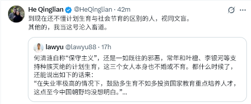 何清漣は自らを「保守派」と称しているが、相変わらず邪悪だ。葉檀、李銀河らと共に、ジェノサイド的な家族計画政策を長年支持してきた。この3人は結婚もしておらず、子供もいない。彼女は今でもこう言うことができる。
