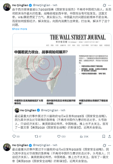 西側メディアは、2025年版米国国家安全保障報告書が中国をもはや敵国とみなしておらず、ヨーロッパを最大の脅威と見なし、戦略的に西半球に縮小していると一般的に受け止めているため、中国による台湾攻撃はあり得る。この記事は、WSJがツボを押さえたと見做している。実際、中国が今抱えている最大の問題は台湾ではなく、いかに経済を活性化させ、雇用問題を解決し、国内消費主導型経済へと転換するかにあると私は考えている。台湾を攻撃しても問題は解決しない。