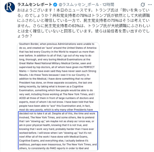 12/10Rasmussen Reports<Too Old? Democrats Have Doubts About Trump=高齢?民主党はトランプ氏に疑念>