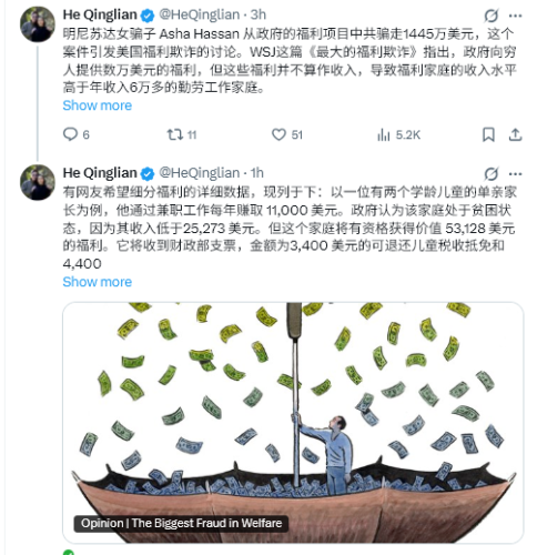 ミネソタ州の女詐欺師、アシャ・ハッサンが政府の福祉プログラムから1,445万ドルを詐取し、米国における福利詐欺をめぐる議論が巻き起こっている。WSJの記事「最大の福利詐欺」は、政府が貧困層に数万ドルの福利給付金を支給しているにもかかわらず、この給付金が収入としてカウントされていないため、福祉受給者の収入水準は年間6万ドル以上を稼ぐ勤勉な家庭よりも高いと指摘している。