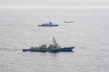 南シナ海をフィリピン海軍のフリーゲート艦「ホセ・リサール」と編隊を組んで航行する米海軍のミサイル駆逐艦「ラファエル・ペラルタ」、米海軍の対潜哨戒機「P-8A」が海面すれすれの超低空を飛行している(12月10日、米海軍のサイトより)