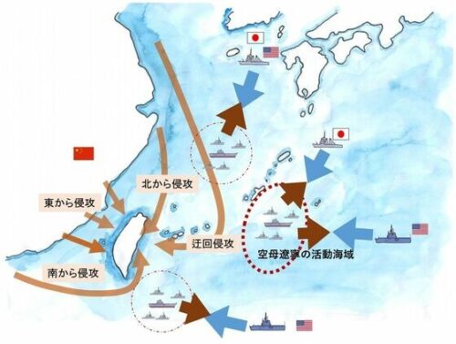 中国の台湾侵攻は、北・東・南からの侵攻と日本の南西諸島を通過して、台湾の背後に回る迂回侵攻が考えられる。
