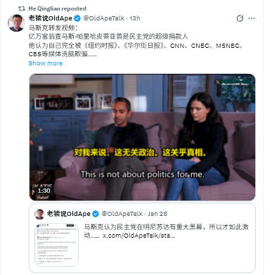 マスクが動画をリツイート:億万長者の Chamath Palihapitiya はかつて民主党のスーパー献金者だった。彼は、NYT、WSJ、CNN、CNBC、MSNBC、CBSといったメディアに完全に洗脳され、騙されたと考えている…