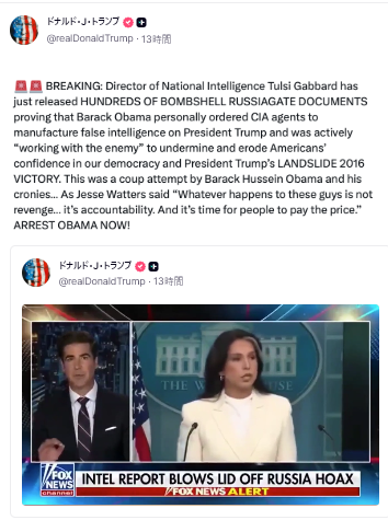 トゥルシ・ギャバード氏: 私たちが発見し、公表した証拠は、オバマ大統領がこの情報評価の捏造を主導していたことを直接示しています。この事実を裏付ける証拠と情報は複数あります。