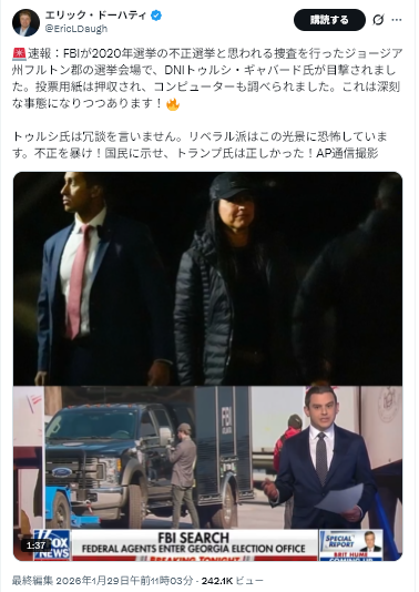 ギャバード氏は水曜日、FBIがジョージア州フルトン郡選挙管理局で捜索令状を執行した際に立ち会っており、民主党議員から批判を浴びている。