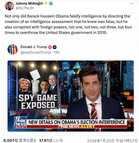 1/29The Gateway Pundit<Tulsi Gabbard Releases Documents that PROVE it Was Barack Obama who Led the Russiagate Conspiracy and Coup Against Donald Trump – Documents Have Been Turned Over to the DOJ=トゥルシ・ギャバードが、ロシアゲート陰謀とドナルド・トランプに対するクーデターを主導したのはバラク・オバマだったことを証明する文書を公開–文書は司法省に引き渡された>