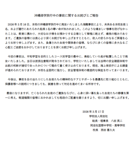 4/6TBSニュース<【辺野古沖転覆事故】死亡した同志社国際高女子生徒の父親がつづった心境「心の整理などつくはずもなく…」 学校側の安全管理について「現地での引率放棄をよしとした感覚に言葉失う」>