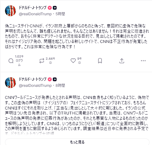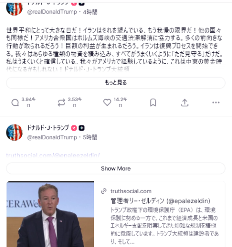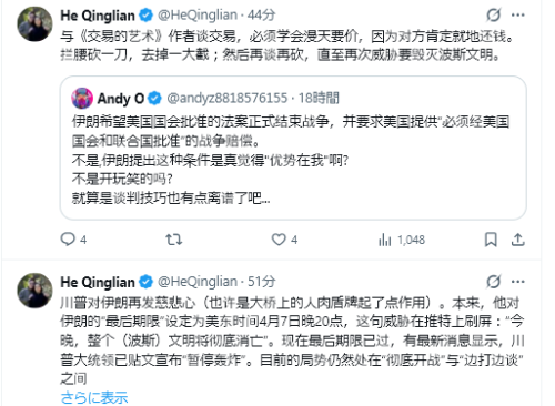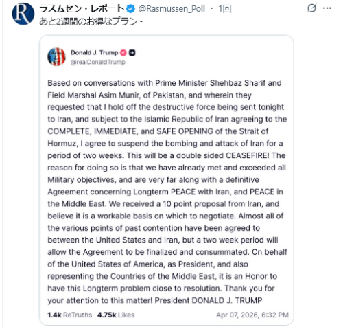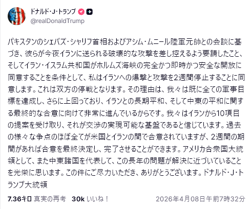 トランプ大統領、再びイランに慈悲を示す(橋の上での人間の盾が何らかの効果を発揮したのかもしれない)。当初、トランプ大統領はイランに対し、4月7日午後8時(米国東部時間)を「期限」とし、「今夜、(ペルシャ)文明全体が滅びる」という脅し文句をツイッターで発信し、大きな話題となった。期限が過ぎた今、トランプ大統領は「爆撃の一時停止」を発表したと報じられている。現状は「全面戦争」と「交渉しながら戦う」の中間にある。