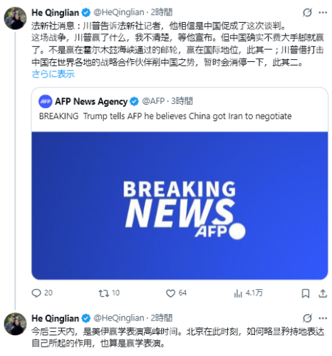 速報:トランプ大統領はAFPに対し、中国がイランを交渉に引き込んだと信じていると述べた。
