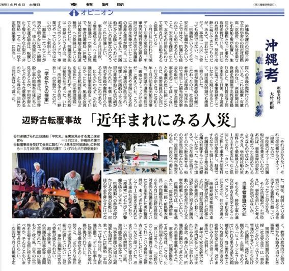 ところが、3月16日に沖縄県名護市辺野古沖で生じた同志社国際高校の生徒を乗せた反米軍基地団体の2隻の小型船が、2隻とも転覆して生じた2名死亡、14名が負傷した事件については、この時とまさに対照的な、実に静かな報道となっている。産経新聞以外はろくな後追い報道もしていない。