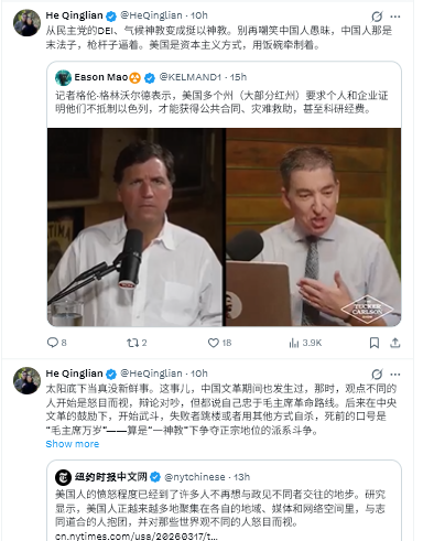 民主党支持者でDEI(多様性、公平性、包摂性)と気候変動カルト支持者から、親イスラエルカルト支持者になった者へ。中国人を愚昧と嘲笑するな。中国人は銃で脅されているから何もできない。米国は資本主義体制で運営されており、飯の種を使ってコントロールしている。