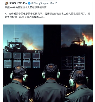 カナダの民主活動家、盛雪は、イランに派遣された中国人レーダー技術者3人に加え、DJIのドローン技術者7人も爆撃で死亡したこと、またイランにいた中国人専門家と技術者300~400人の消息が不明であることを明らかにした。