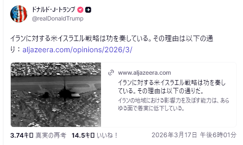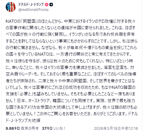 3/18阿波羅新聞網<刚刚,川普宣布中东终局—川普痛批:北约犯了一个极其愚蠢的错误=トランプ、中東情勢の終結を発表―NATOは極めて愚かな過ちを犯したと非難>
