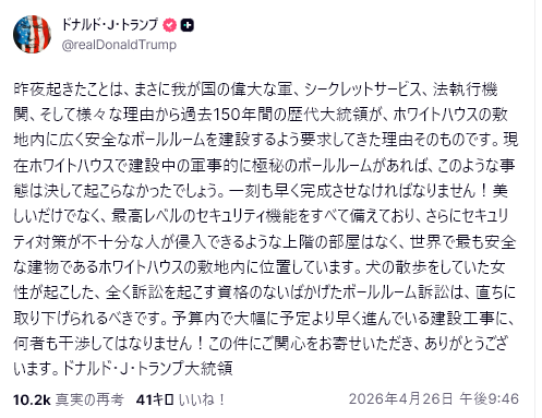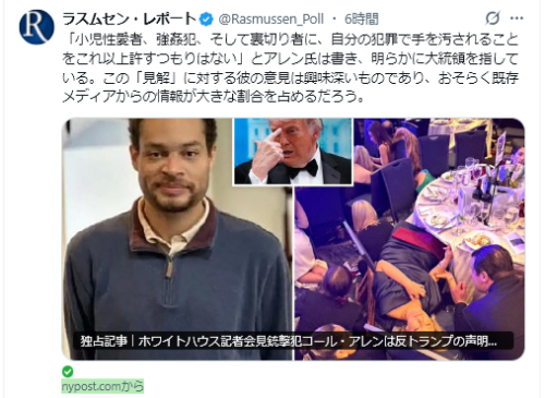 世論は常に流動的で、2024年の大統領選挙の年に起きた2件の暗殺未遂事件や、昨日の2026年のWH記者協会夕食会に見ることができる。あの年は伝説的な年だったが、昨日の夕食会は、その伝説的な目的を達成できなかっただけでなく、あの年には声を上げる勇気がなかった多くの人々が不満をぶちまけ、あの年から今に至り、立場を変えた人々の発言も見られた。