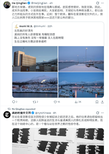 あの場所は静かだ。スウェーデンとノルウェーはノーベル賞授与の地で、住民たちは気分よく暮らしをしているが、ただ退屈している。そのため、小は難民保護から大は元首相、皇太子妃、各政治家まで、常にトラブルを探し求めている。皆、あらゆる方法でトラブルを巻き起こしている。最近の例を挙げると、ヨーロッパ全体で、エプスタイン文書に関与したとされる人の割合は他のヨーロッパ諸国よりも高い。しかも、これは公表されている部分だけだ。