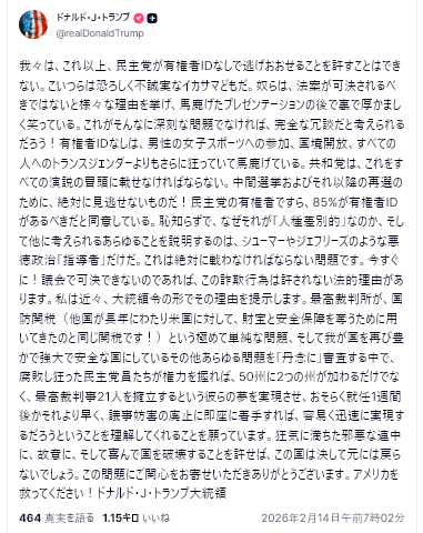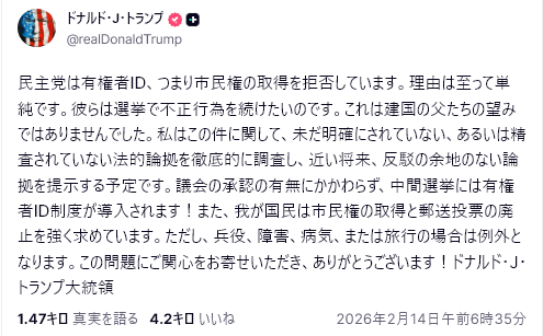 2/13The Gateway Pundit<JUST IN: President Trump Says He Will Sign Executive Order Mandating Voter ID “Shortly” as Senate Debates SAVE Act – “It is a CAN’T MISS FOR RE-ELECTION IN THE MIDTERMS, AND BEYOND!”= 速報:トランプ大統領は、上院がSAVE法案を議論する中、有権者IDを義務付ける大統領令に「まもなく」署名すると述べ、「中間選挙およびそれ以降の再選に向けて、見逃せない法案だ!」>