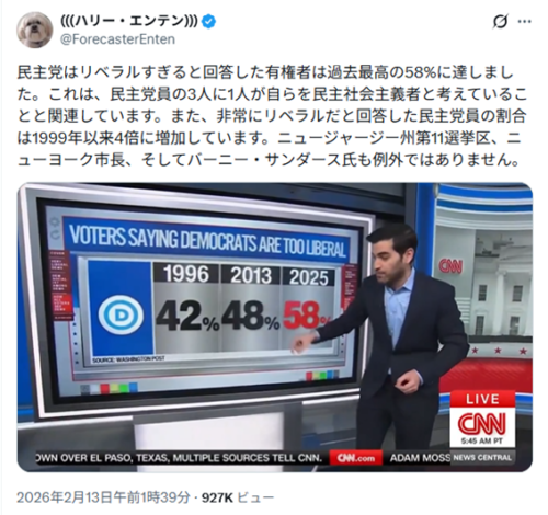 2/13The Gateway Pundit<CNN’s Harry Enten: While the Far Left is Significantly More Powerful in the Dem Party, All-time High of Voters say Party is ‘Too Liberal’ (Video)=CNNのハリー・エンテン記者:民主党内で極左勢力が大幅に拡大している一方で、同党が「リベラルすぎる」と回答した有権者は過去最高に上る(動画)>
