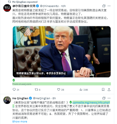 《米英協定は「戦略的不確実性」か、それとも戦略的後退か? 》https://upmedia.mg/news_info.php?Type=2&SerialNo=230046 全世界が米中関税交渉に注目し、米中交渉に劣らず重要な米英貿易協定を完全に無視している。この協定の調印は、トランプ大統領の関税戦争の深刻なジレンマを反映している:1.トランプ大統領は、関税戦争で貿易赤字を解消することは不可能だと実は分かっていた。2.他の国々は様子見で、英国のやり方を見せて、トランプの手の内を世界に知らしめた。