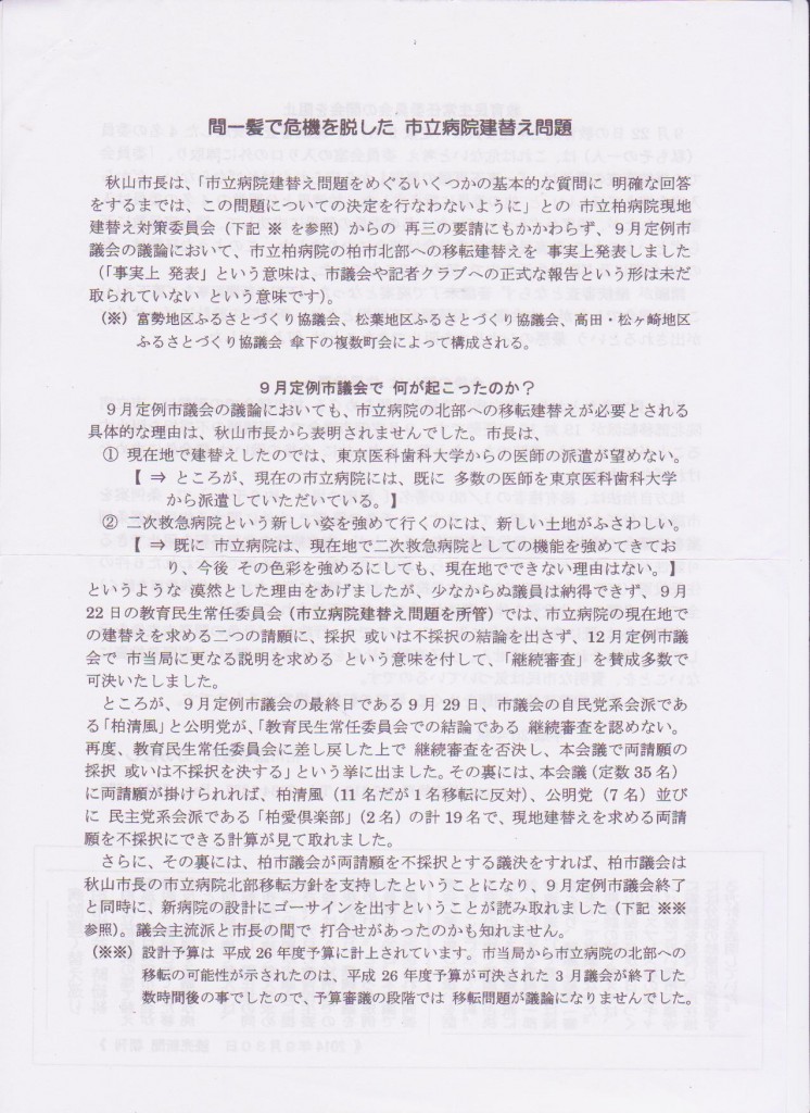 柏市立病院の建て替え問題について 現在の市立病院は「柏市布施1−3」にありますが、秋山市長は「柏の葉キャンパス」駅近くに移転させたいようです。「柏の葉キャンパス」駅の近くには既に「辻仲病院柏の葉」があり、集約するメリットはなく、却って今まで「布施」まで通っていた人(特に布施の近隣にお住いの方)に不便を強いることになります。柏市民の力で移転を食い止め、現在の地に建て替えできるようにしたいです。方法は住民投票です。上橋柏市会議員はこの運動に賛成しております。下のチラシを参照ください。 上橋議員のチラシ