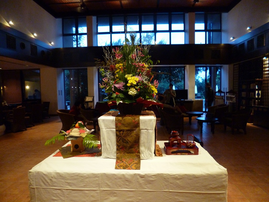 西表島について-3 ホテルの正月飾り ホテルのプライベートビーチ 人を怖がらないチュウサギ 浦内川マングローブ 浦内川からの海側 キッチンイナバのオリオンビール キッチンイナバの魚カルパッチョ キッチンイナバのガサミ汁 キッチンイナバの社長の三線